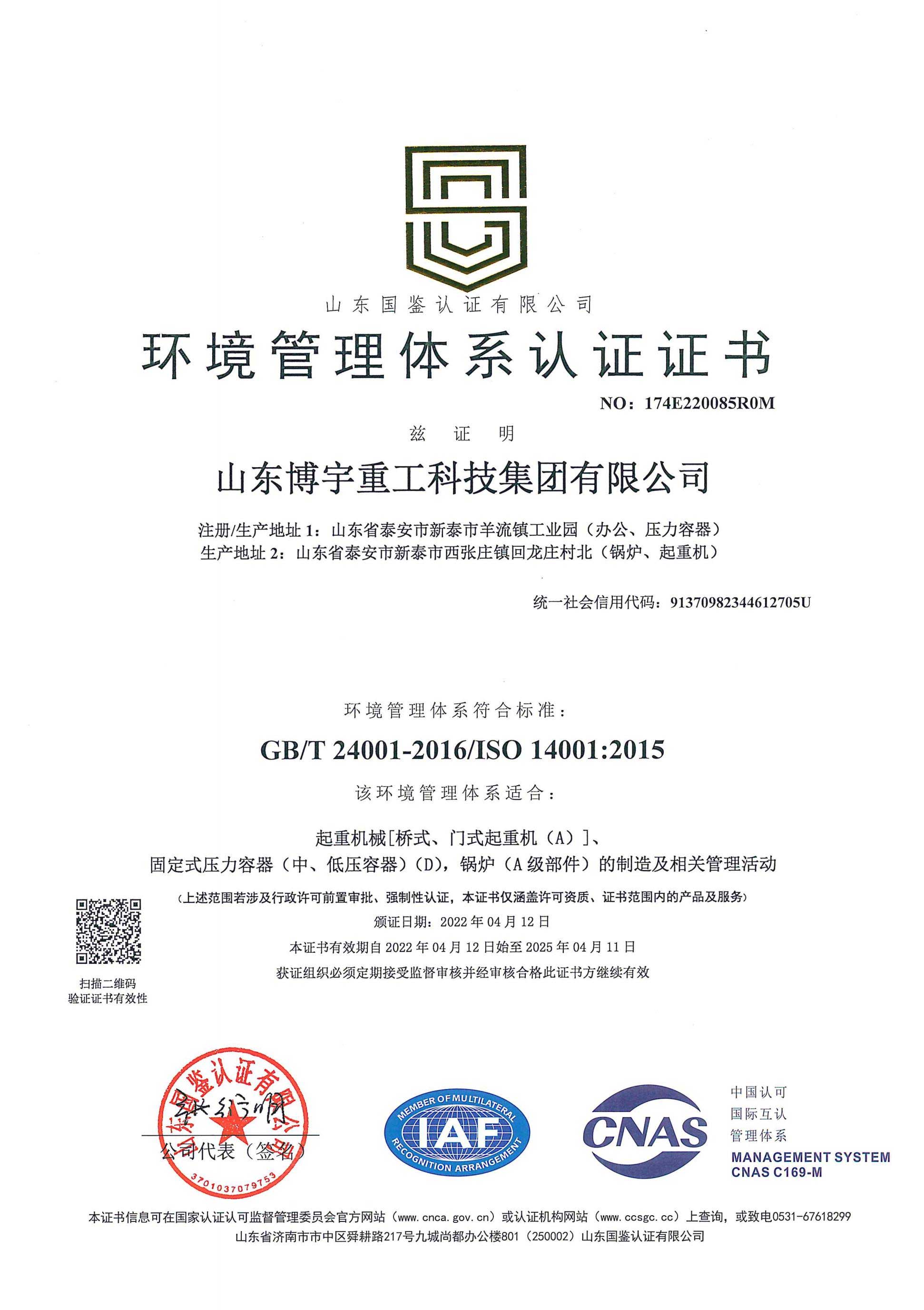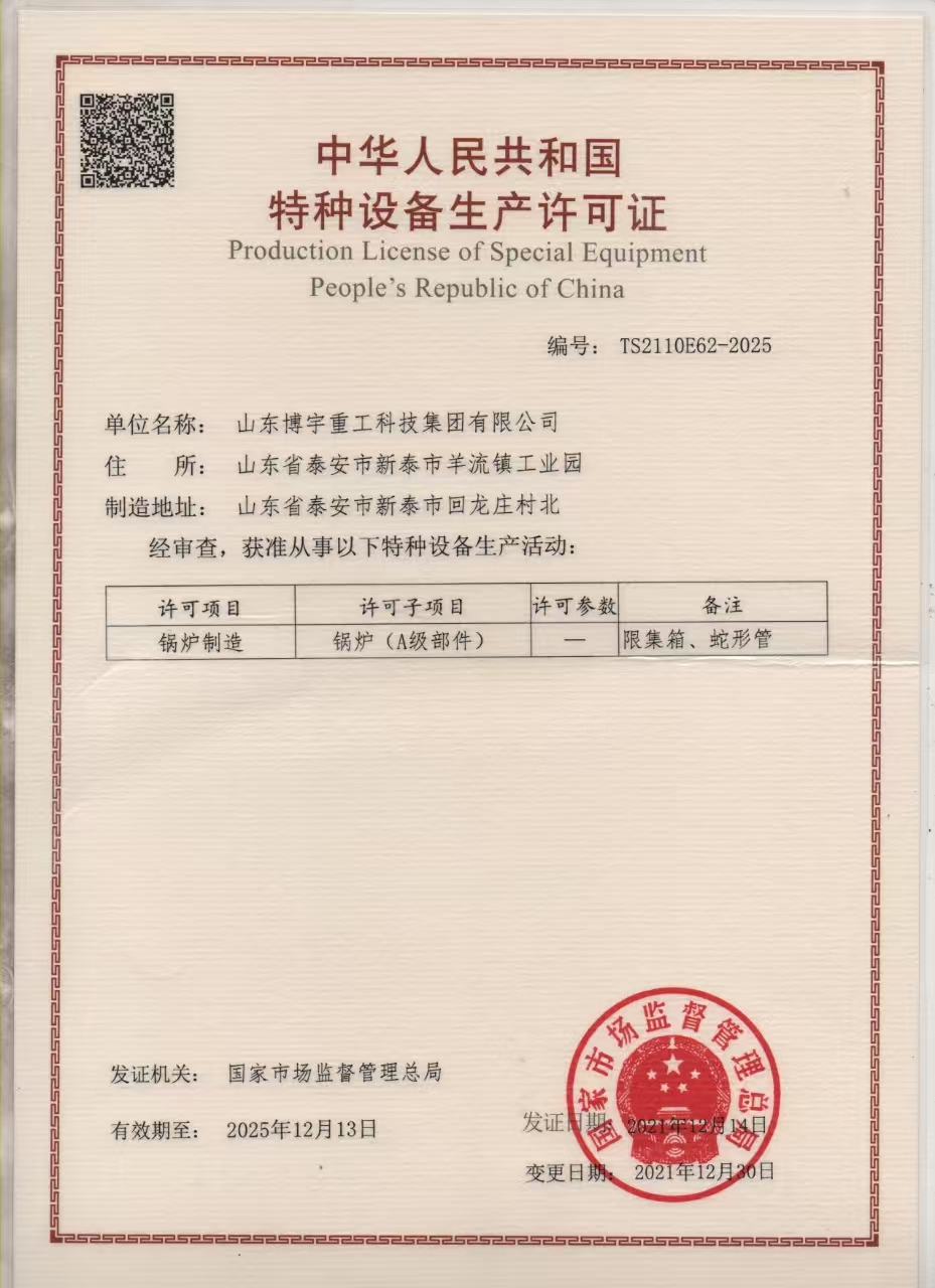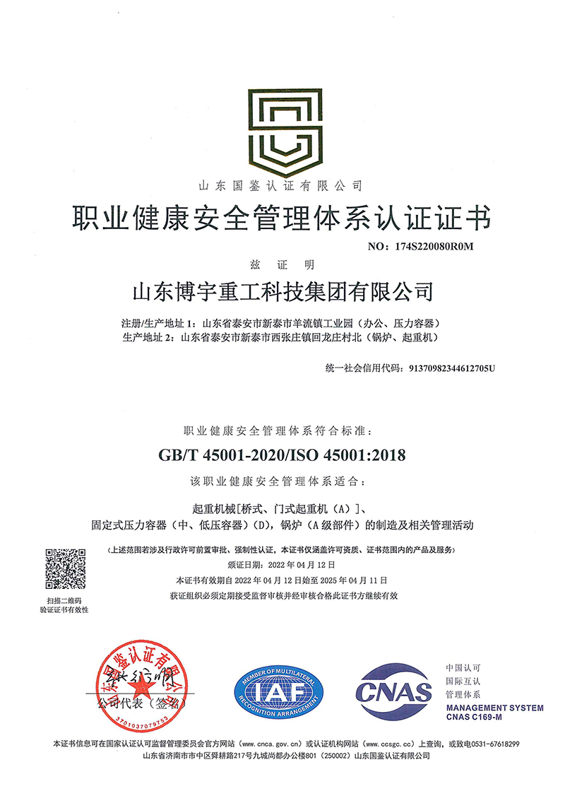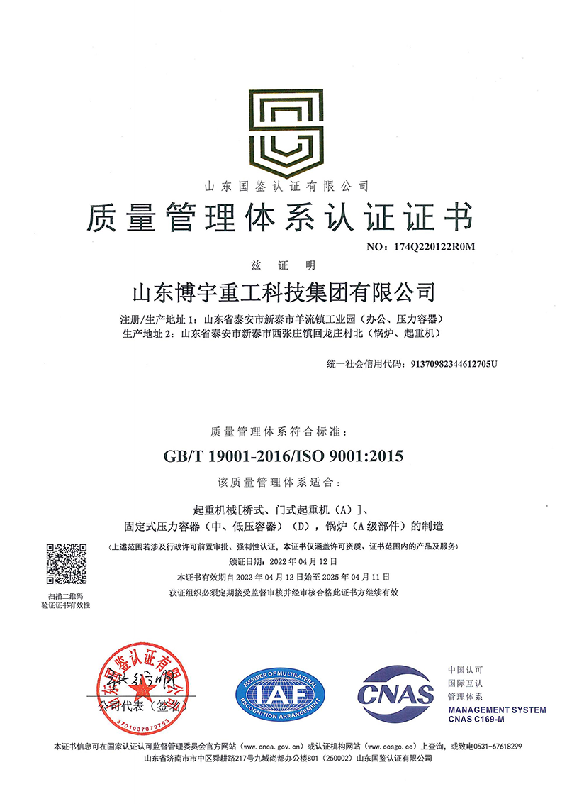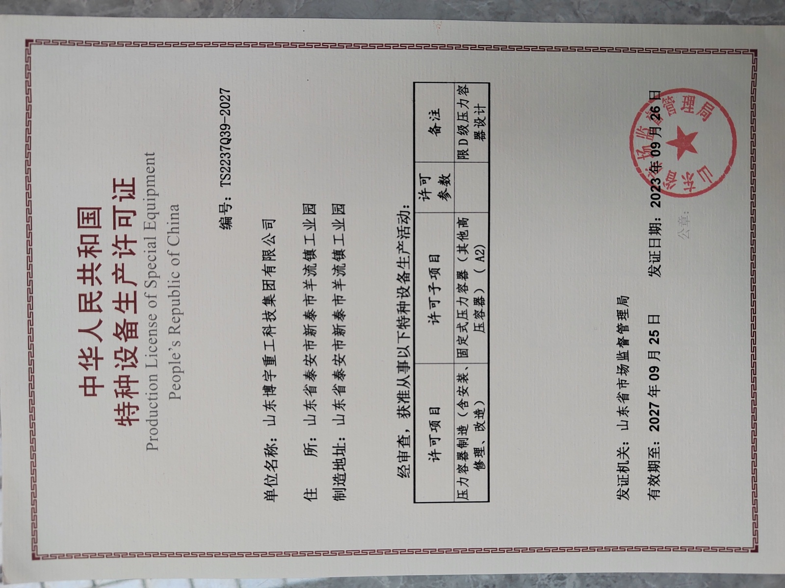 山東博宇重工科技有限公司,坐落在五岳之尊、風景秀麗的泰山腳下,公司占地面積160000平方米,建筑面積100000平方米,擁有固定資產陸仟壹佰陸拾萬元整,現有職工760人,其中工程技術管理人員118人,副高職稱5人,初、中級職稱25人,公司獲得國家質檢總局授予的A2類壓力容器制造許可證,A級鍋爐部件資質,起重機生產制造許可證,且質量管理通過了ISO9001:2008質量認證。